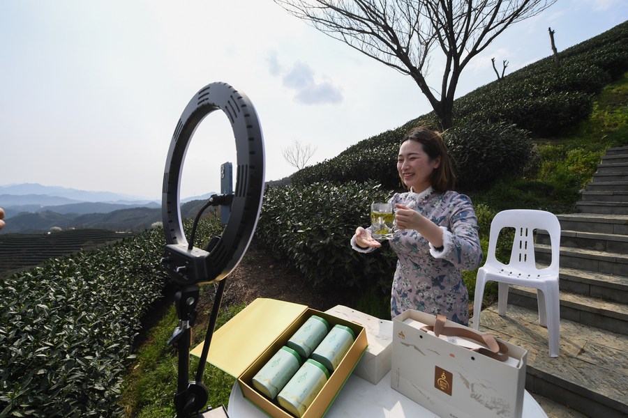 A volunteer promotes spring tea products via live streaming on a tea farm in Bashan Village of Fuyang District, Hangzhou, east China's Zhejiang Province, March 15, 2021. (Xinhua/Xu Yu)