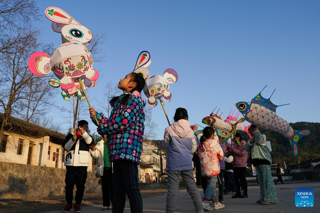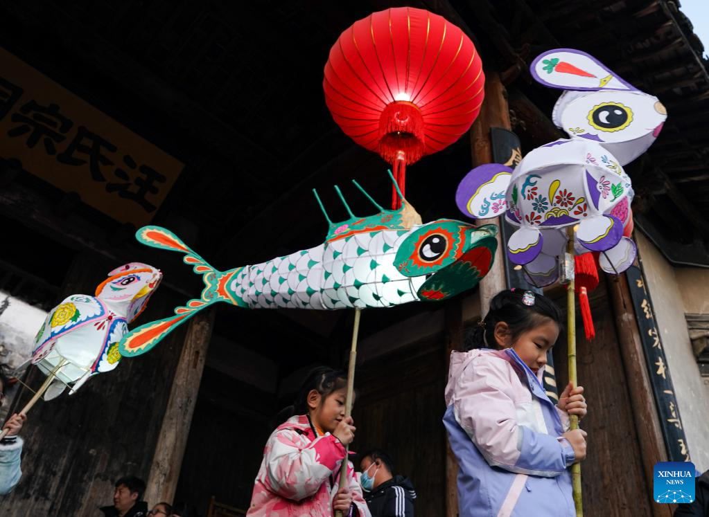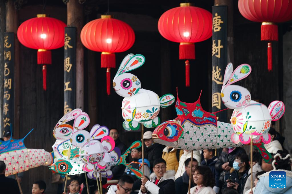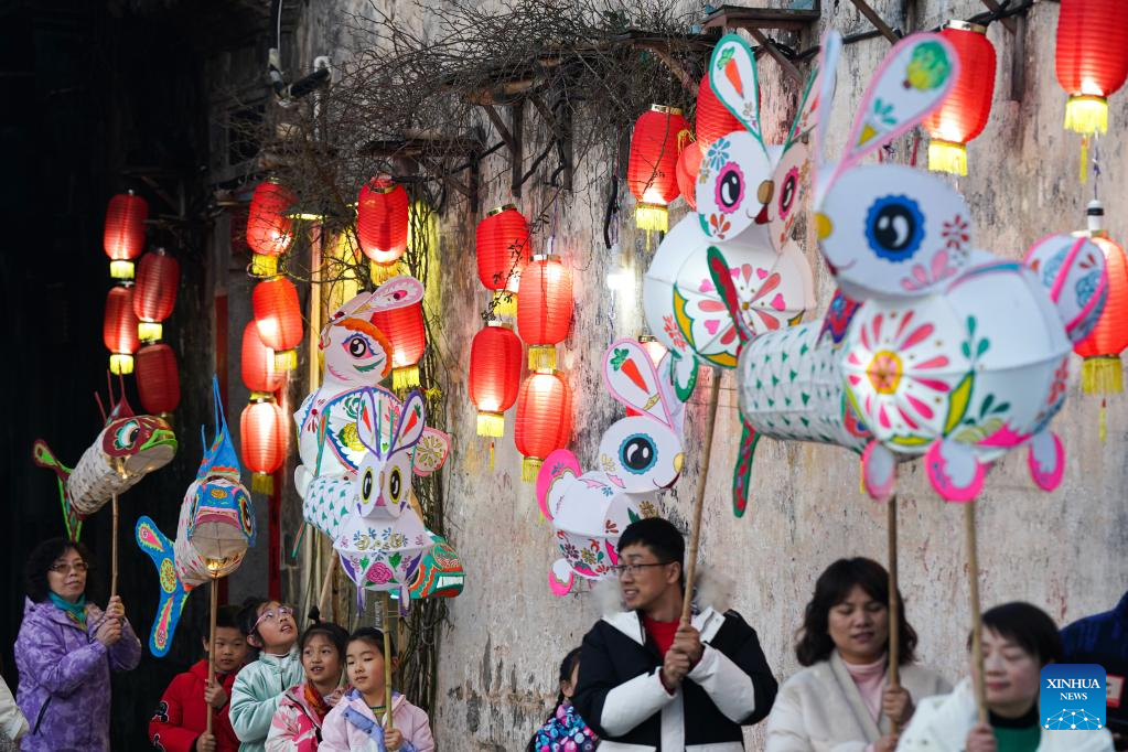 Tourists take part in a lantern parade at Hongcun Village in Yixian County, east China's Anhui Province, Jan. 30, 2023. Tourists here learned making rabbit-shaped lanterns and take part in a lantern parade to celebrate the Chinese New Year. (Xinhua/Du Yu)