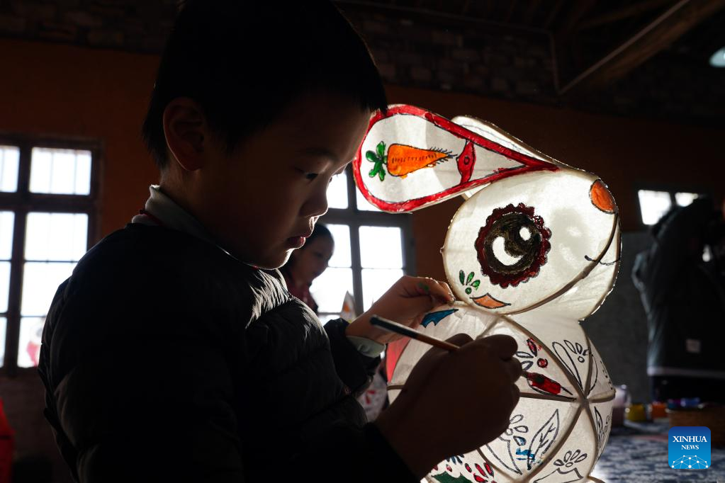 A boy learns to make a rabbit-shaped lantern at Hongcun Village in Yixian County, east China's Anhui Province, Jan. 30, 2023. Tourists here learned making rabbit-shaped lanterns and take part in a lantern parade to celebrate the Chinese New Year. (Xinhua/Du Yu)