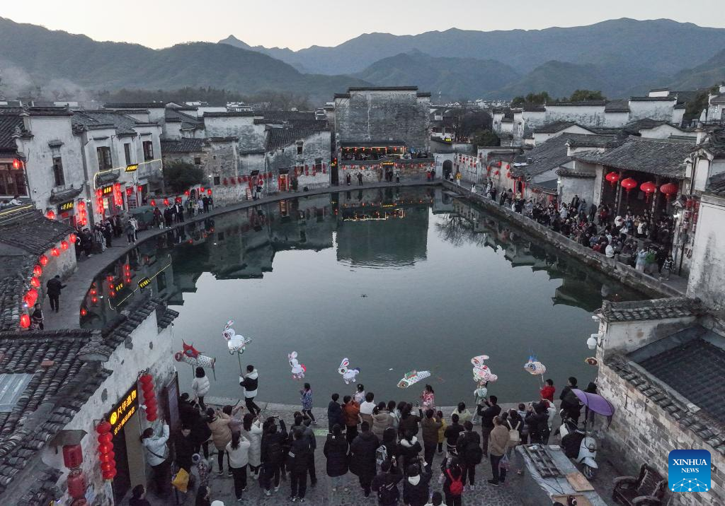 This aerial photo taken on Jan. 30, 2023 shows tourists taking part in a lantern parade at Hongcun Village in Yixian County, east China's Anhui Province. Tourists here learned making rabbit-shaped lanterns and take part in a lantern parade to celebrate the Chinese New Year. (Xinhua/Du Yu)
