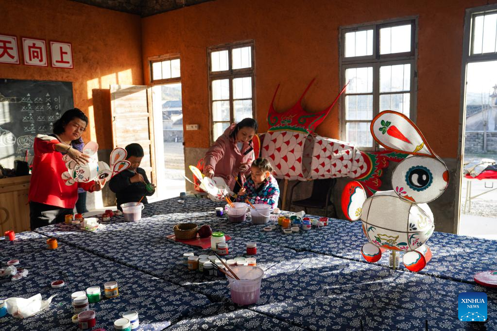 Tourists learn to make rabbit-shaped lanterns at Hongcun Village in Yixian County, east China's Anhui Province, Jan. 30, 2023. Tourists here learned making rabbit-shaped lanterns and take part in a lantern parade to celebrate the Chinese New Year. (Xinhua/Du Yu)