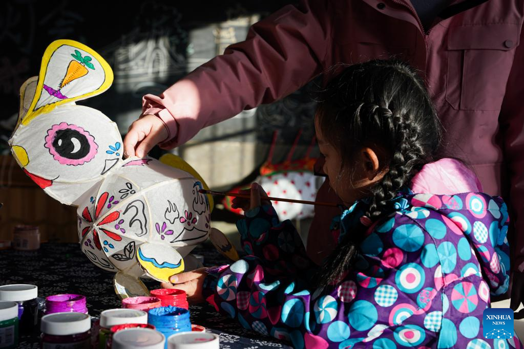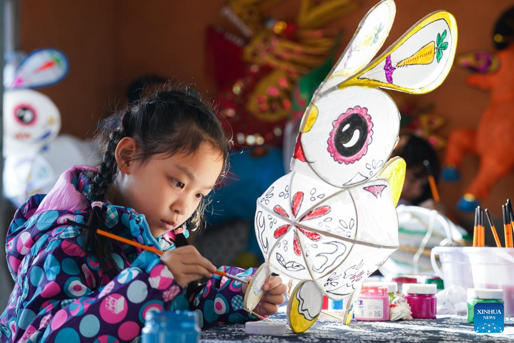 A girl learns to make a rabbit-shaped lantern at Hongcun Village in Yixian County, east China's Anhui Province, Jan. 30, 2023. Tourists here learned making rabbit-shaped lanterns and take part in a lantern parade to celebrate the Chinese New Year. (Xinhua/Du Yu)