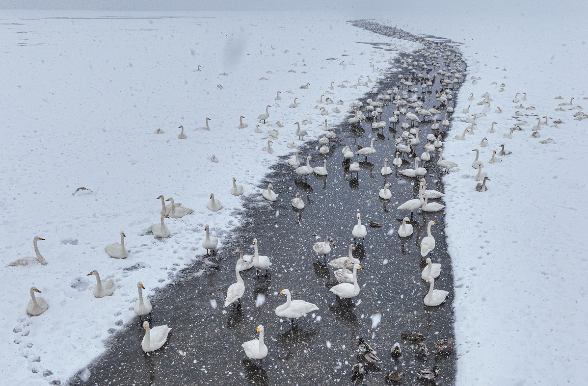 In Rongcheng, Shandong province, whirling snow and whooper swans create beautiful winter scenery recently. [Photo by Li Xinjun/For chinadaily.com.cn]