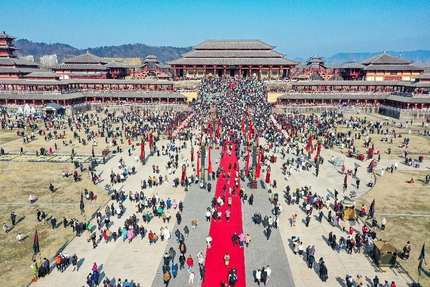Photo taken on Jan. 25, 2023 shows crowds of tourists visiting the Hengdian World Studios, a film studio located in Hengdian, Dongyang, east China's Zhejiang province. (People's Daily Online/Bao Kangxuan)