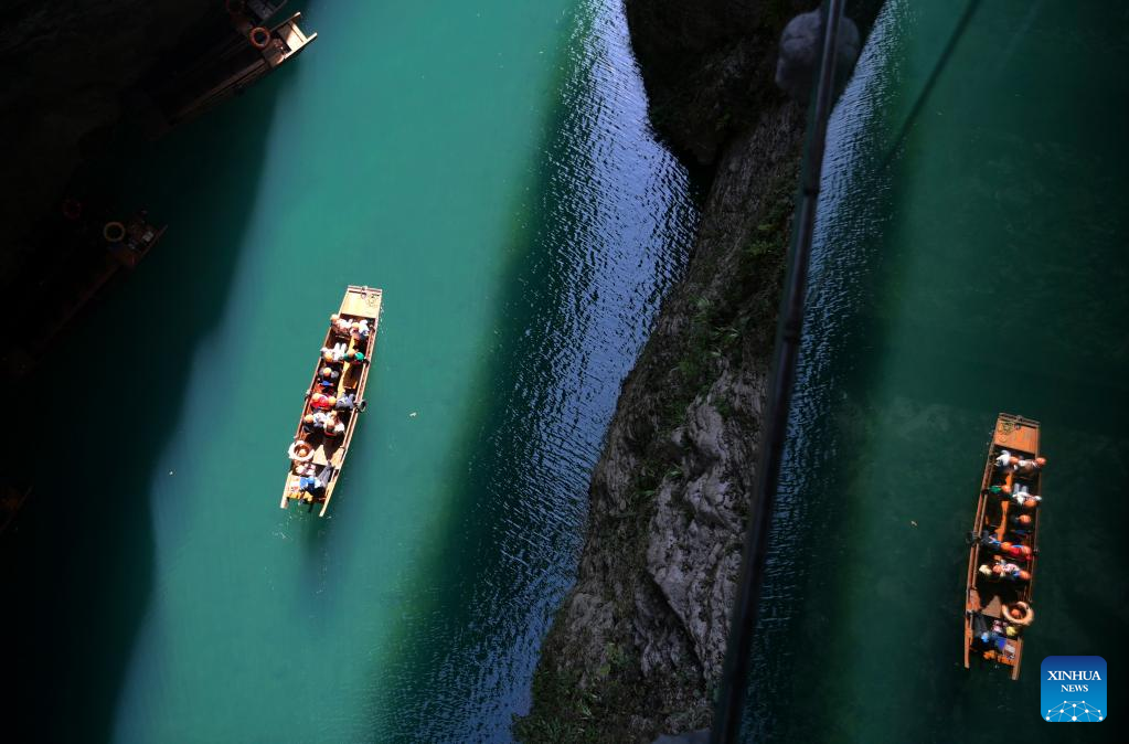 Tourists enjoy boat rides in Pingshan canyon in C China's Hubei