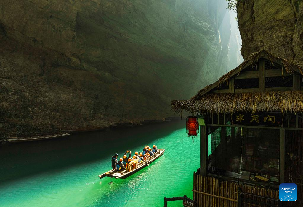 Tourists enjoy boat rides in the Pingshan canyon, a tourist attraction famous for its limpid water, in Hefeng County, central China's Hubei Province, Jan. 30, 2023. (Photo by Yang Shunpi/Xinhua)