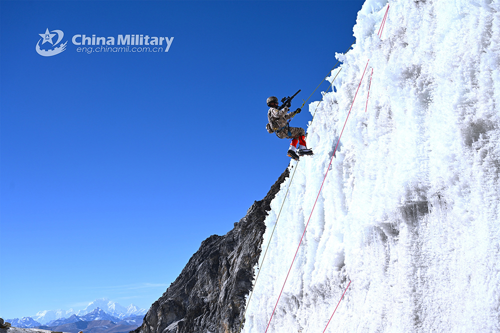 A soldier assigned to a PLA army brigade stationed in Xizang ropes down a cliff covered by thick ice layer with professional climbing equipment during a reconnaissance training exercise on plateau in late December of 2022. (eng.chinamil.com.cn/Photo by Yang Kai)