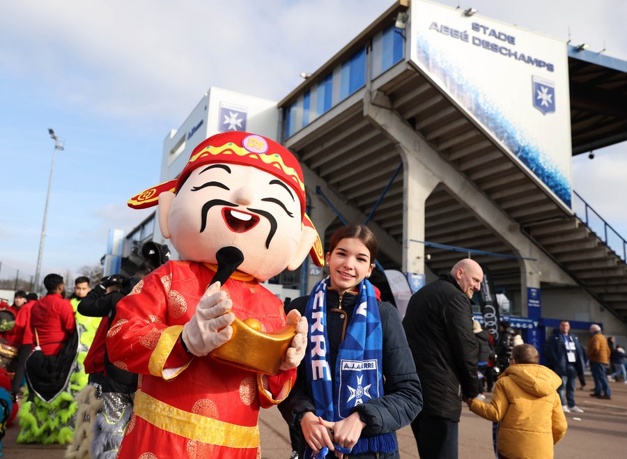 An Auxerre fan poses with a performer dressed up as god of fortune outside the Abbe Deschamps Stadium of Auxerre club before a French Ligue 1 match between Auxerre and Montpellier as part of the Day of China activites to celebrate the Chinese Lunar New Year in Auxerre, France, Jan. 29, 2023. (Xinhua/Gao Jing)