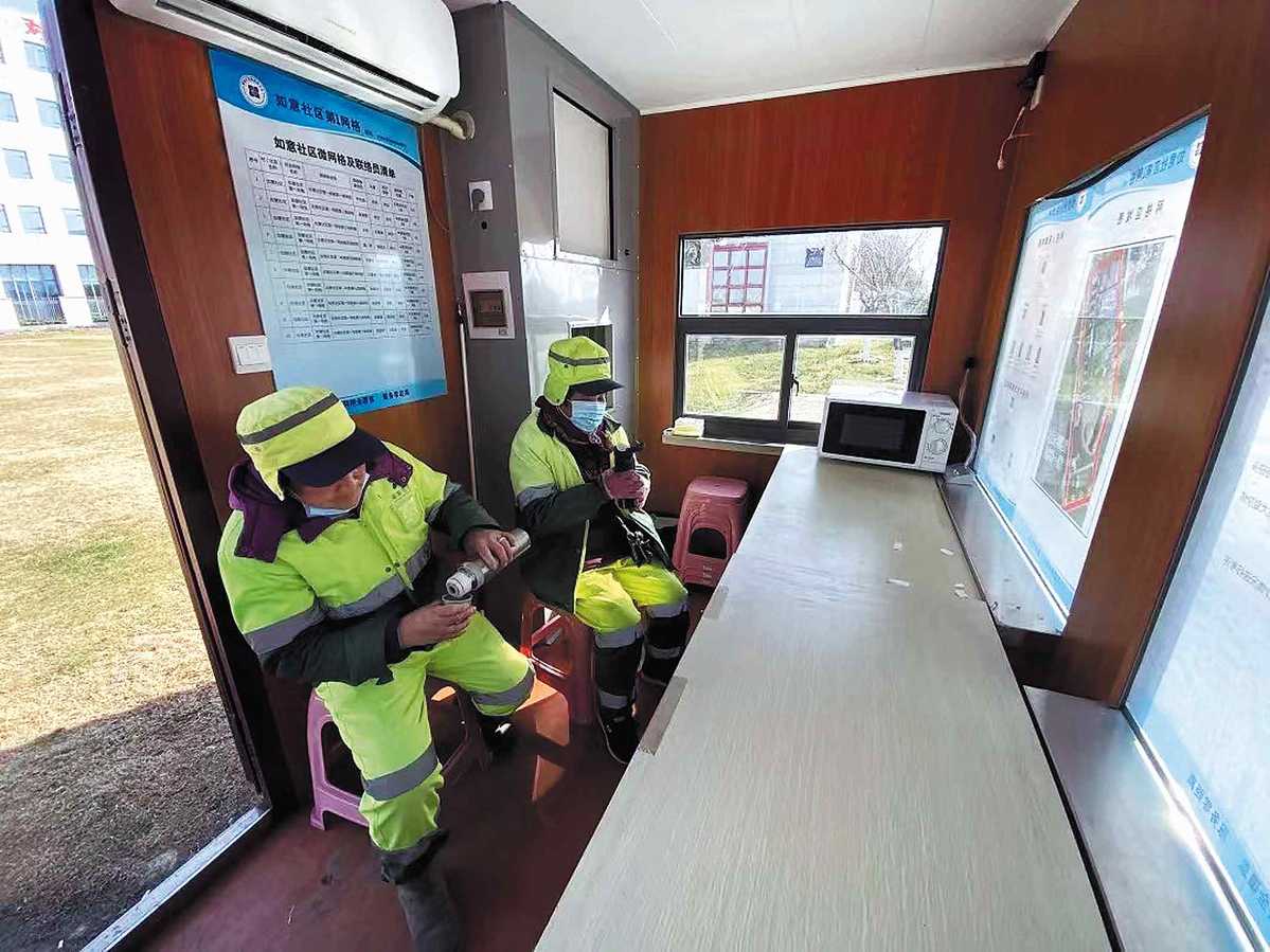 Sanitation workers relax at a rest station repurposed from a COVID-19 testing booth in Suzhou, Jiangsu province, in mid-January. CHINA DAILY