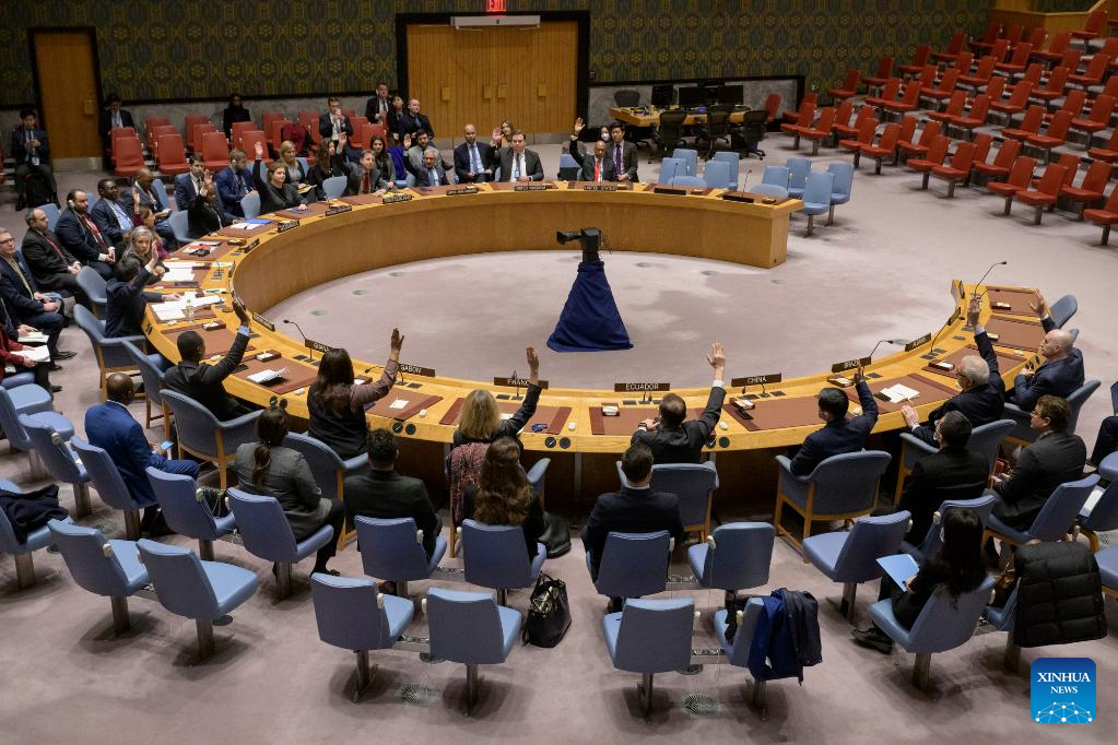 Representatives vote on a draft resolution during a UN Security Council meeting at the UN headquarters in New York, on Jan. 30, 2023. The Security Council on Monday adopted a resolution to extend the mandate of the UN Peacekeeping Force in Cyprus (UNFICYP) for 12 months, till Jan. 31, 2024. (Manuel Elias/UN Photo/Handout via Xinhua)