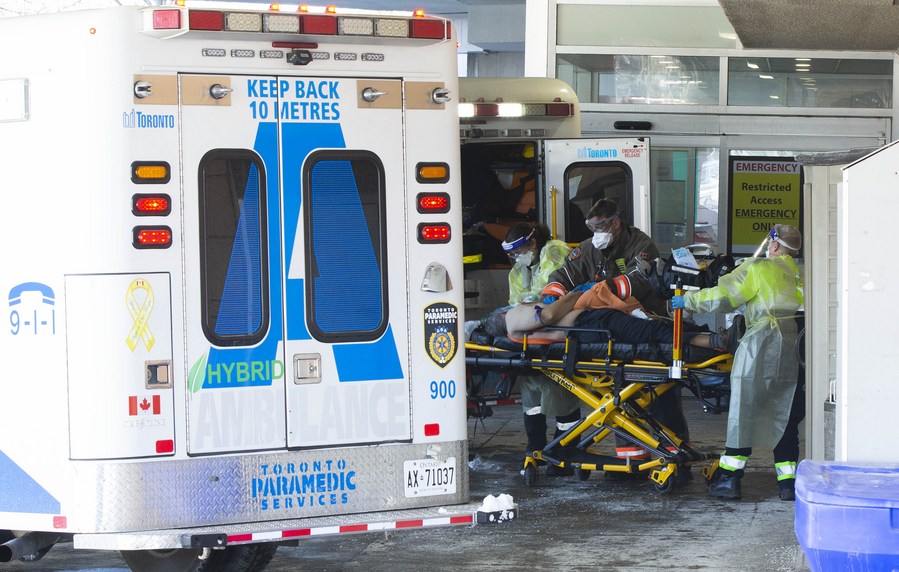 A patient is wheeled out from an ambulance to a hospital in Toronto, Canada, on Jan. 28, 2022. (Photo by Zou Zheng/Xinhua)