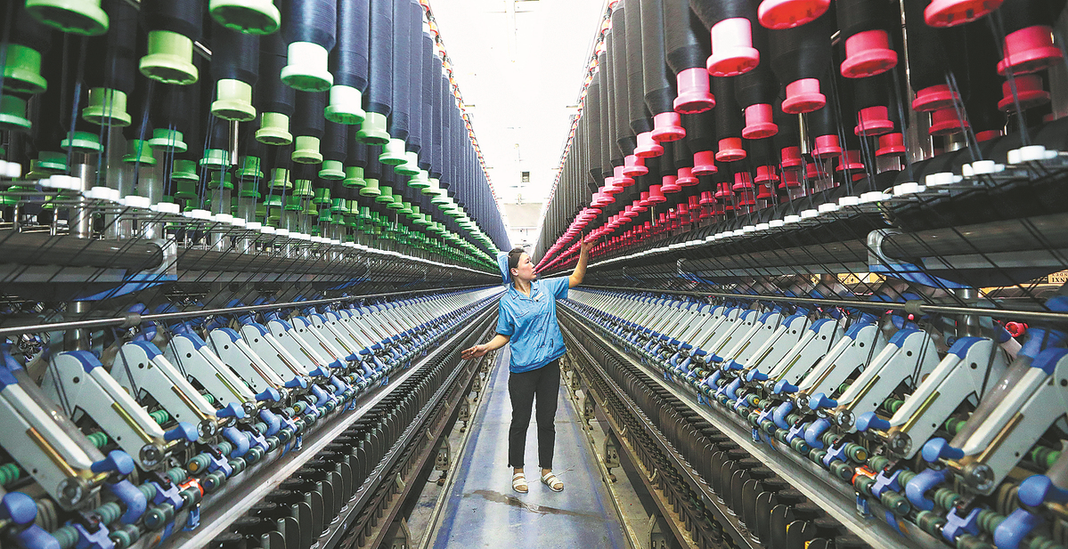 A textile company employee works at a factory in Huai'an, Jiangsu province, on Monday. China's purchasing managers index reached 50.1 in January, passing the 50-point mark that separates growth from contraction. ZHAO QIRUI/FOR CHINA DAILY