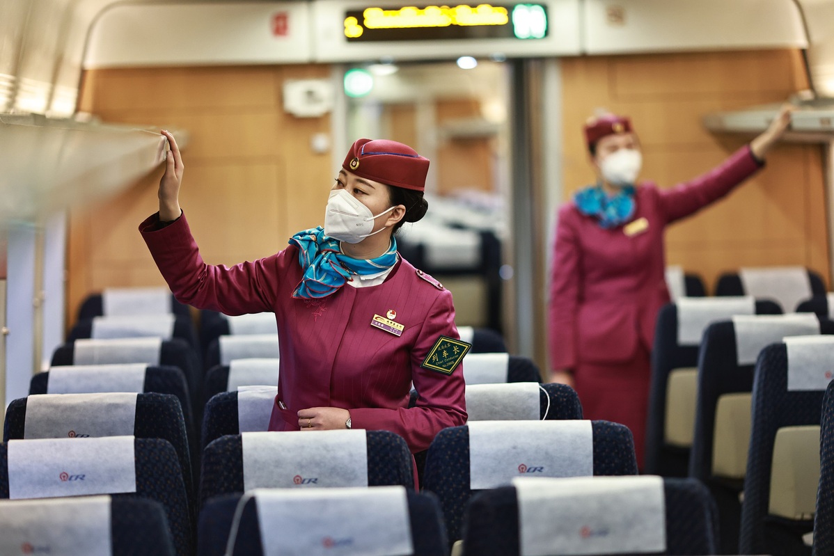 Fan Ailin and her twin sister Fan Aini check luggage racks inside a train compartment. [Photo by Su Zhigang/Provided to chinadaily.com.cn]