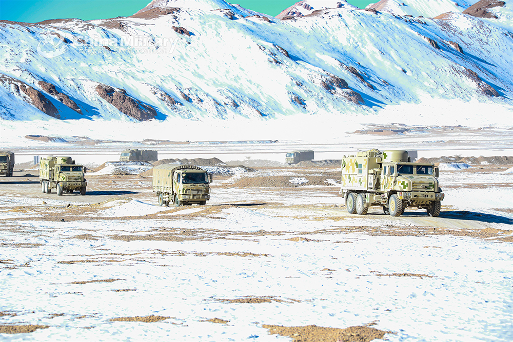 Military vehicles attached to a regiment under the PLA Xinjiang Military Command maneuver quickly en route to the designated area at the elevation of 5300 meters in the real-combat training in middle January, 2023. (eng.chinamil.com.cn/Photo by Chen Ming)