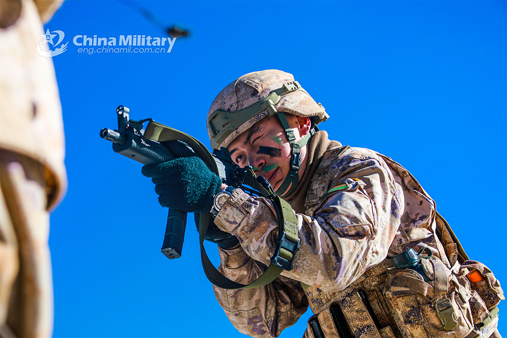 A soldier assigned to a regiment under the PLA Xinjiang Military Command provides security with an automatic gun while moving forward in an unacquainted area with high elevation during the real-combat training in middle January, 2023. (eng.chinamil.com.cn/Photo by Chen Ming)