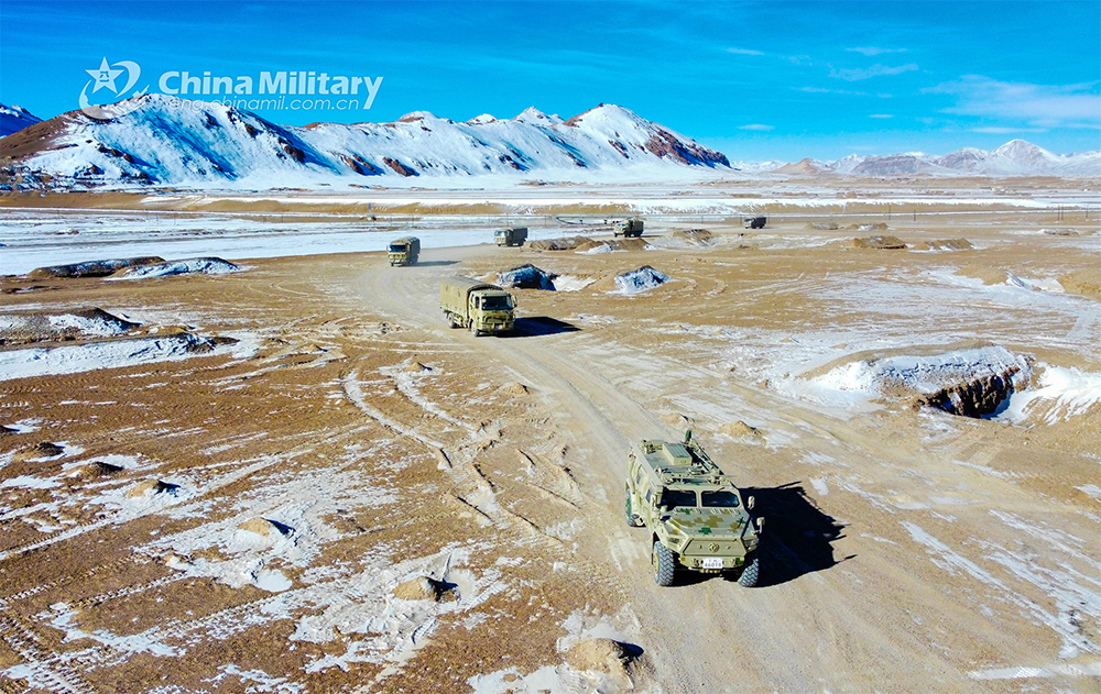 Military vehicles attached to a regiment under the PLA Xinjiang Military Command maneuver quickly en route to the designated area at the elevation of 5300 meters in the real-combat training in middle January, 2023. (eng.chinamil.com.cn/Photo by Chen Ming)