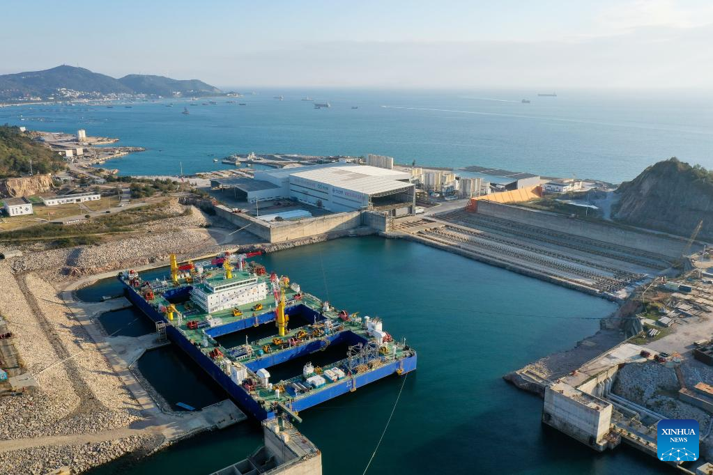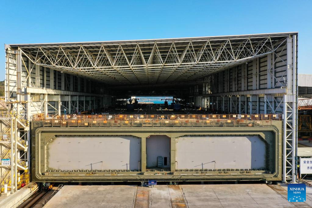 This aerial photo taken on Jan. 30, 2023 shows immersed tube E23 of Shenzhen-Zhongshan highway underwater tunnel at an immersed tube smart factory of CCCC Fourth Harbour Engineering Co., Ltd. on Niutou Island, Zhuhai, south China's Guangdong Province. (Xinhua/Liu Dawei)