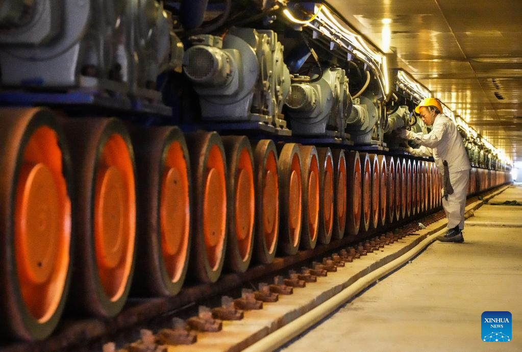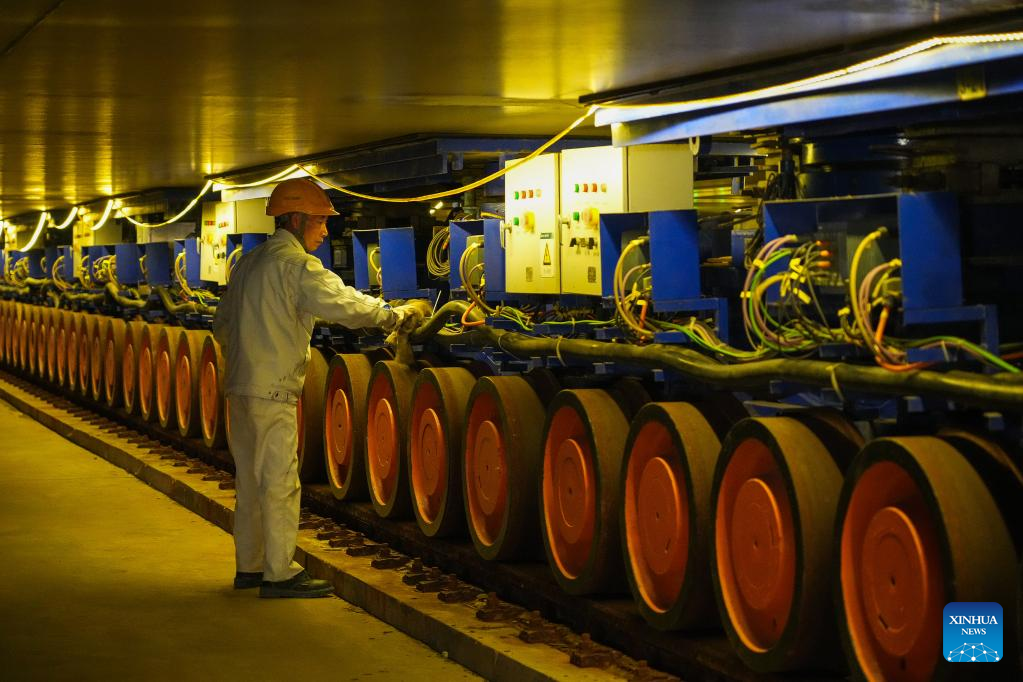 A staff member maintains a device loading immersed tube E23 of Shenzhen-Zhongshan highway underwater tunnel at an immersed tube smart factory of CCCC Fourth Harbour Engineering Co., Ltd. on Niutou Island, Zhuhai, south China's Guangdong Province, Jan. 30, 2023. (Xinhua/Liu Dawei)