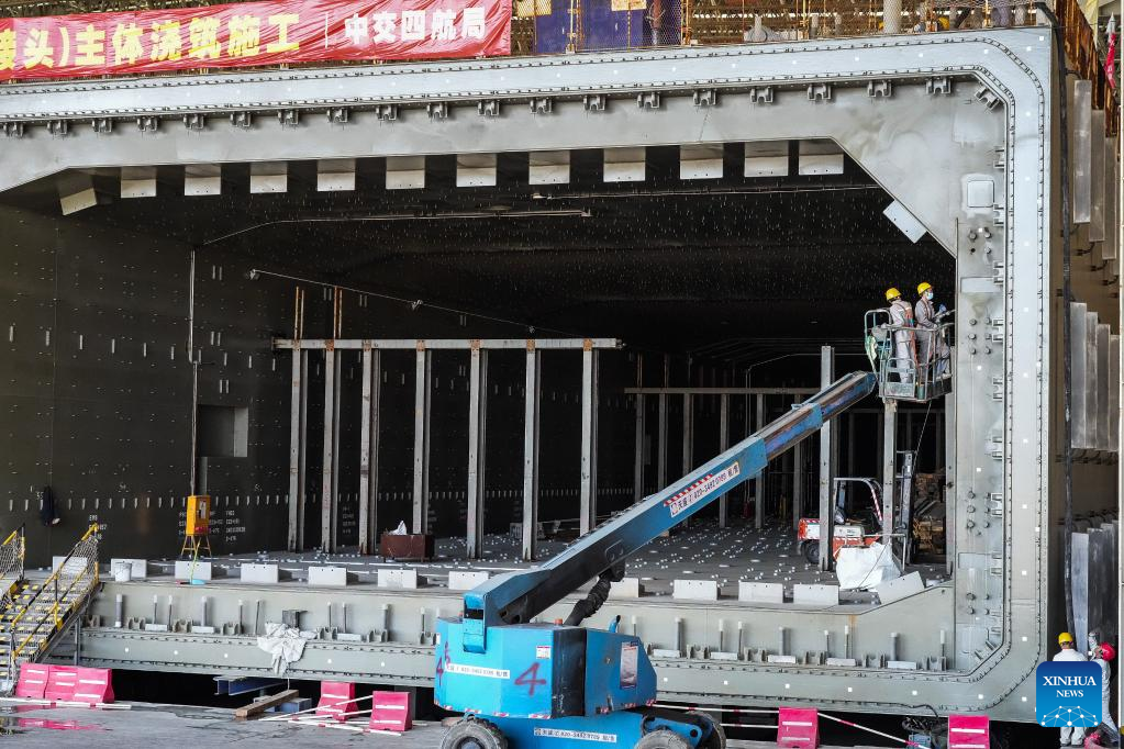 Staff members prepare the outfitting of immersed tube E23 of Shenzhen-Zhongshan highway underwater tunnel at an immersed tube smart factory of CCCC Fourth Harbour Engineering Co., Ltd. on Niutou Island, Zhuhai, south China's Guangdong Province, Jan. 30, 2023. (Xinhua/Liu Dawei)
