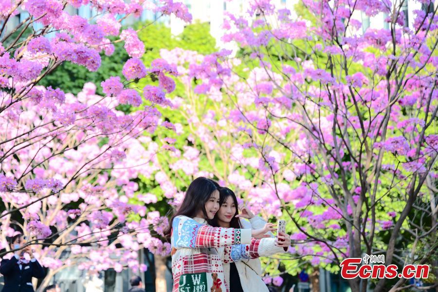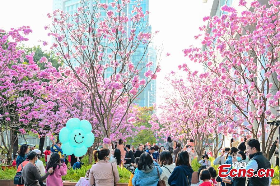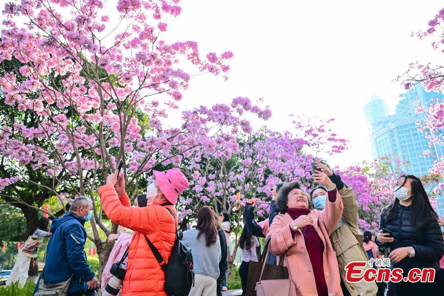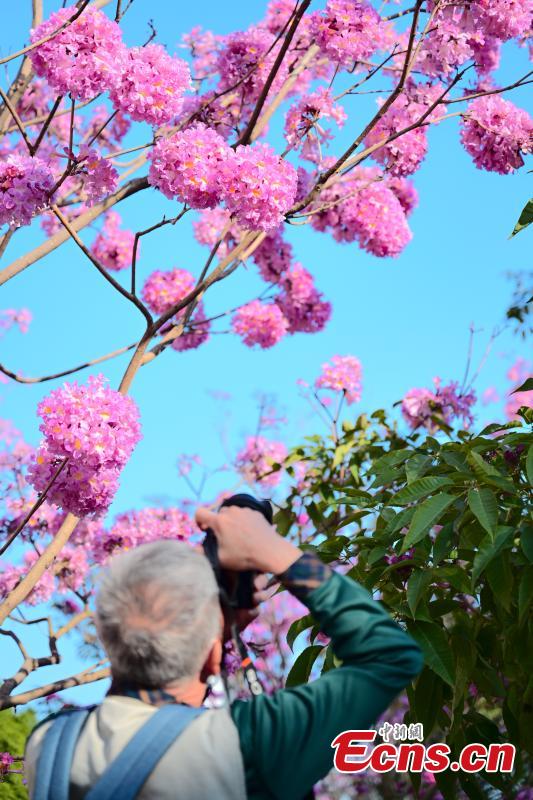 Tourist take photos of pink trumpet flowers in Guangzhou, south China's Guangdong Province, Jan. 31, 2023. (Photo: China News Service/Chen Jimin)