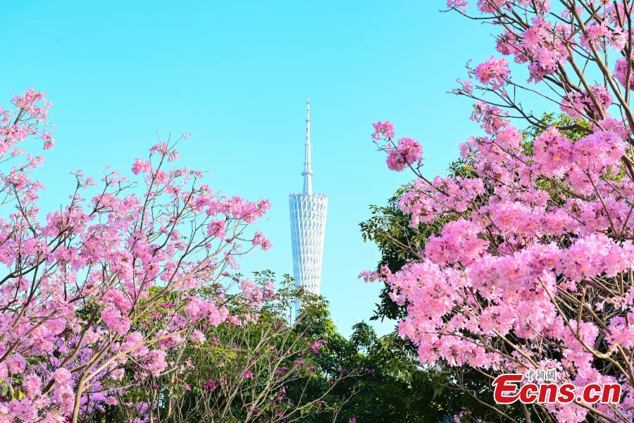 Pink trumpet flowers bloom in Guangzhou, south China's Guangdong Province, Jan. 31, 2023. (Photo: China News Service/Chen Jimin)