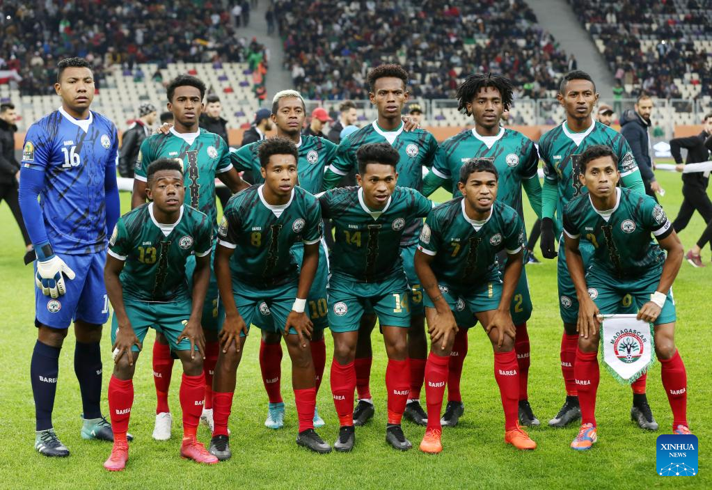Players of Madagascar pose for a group photo before the semifinal match of the 7th African Nations Championship between Senegal and Madagascar at Nelson Mandela Stadium in Algiers, Algeria, Jan 31, 2023. (Xinhua)