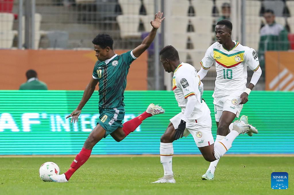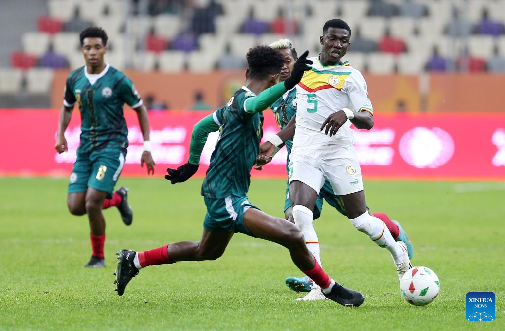 Senegal's Malick Mbaye (L) competes during the semifinal match of the 7th African Nations Championship between Senegal and Madagascar at Nelson Mandela Stadium in Algiers, Algeria, Jan 31, 2023. (Xinhua)
