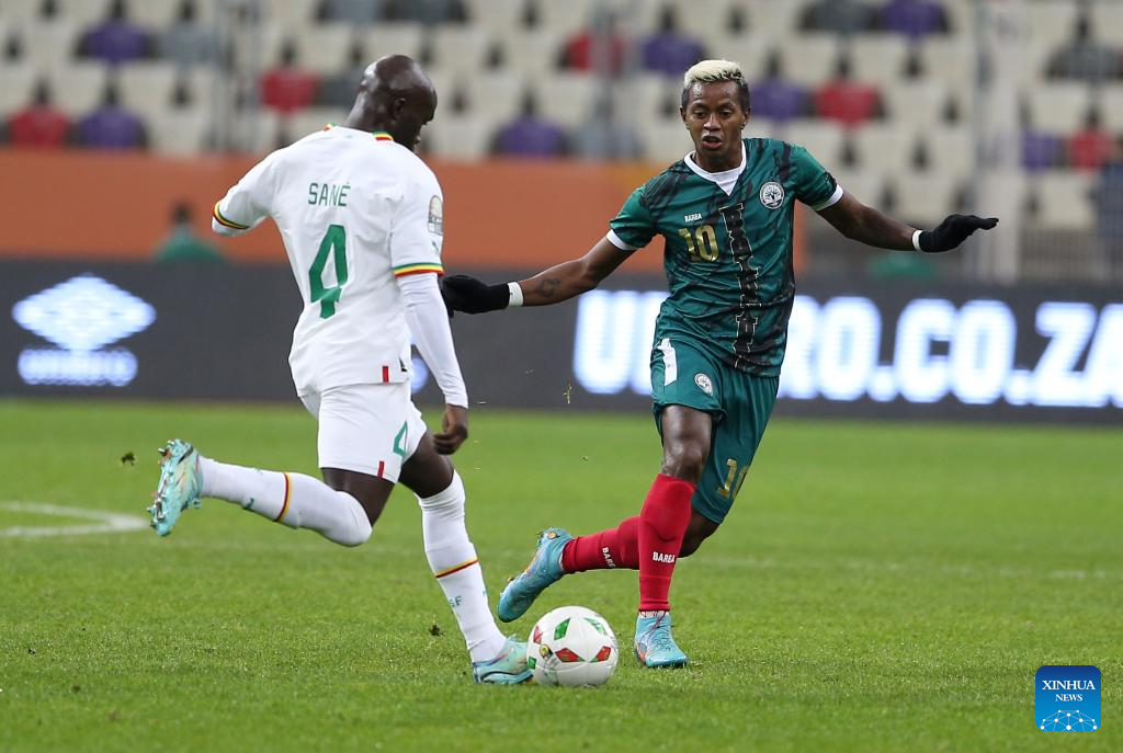 Jean Razafindrakoto (L) of Madagascar competes during the semifinal match of the 7th African Nations Championship between Senegal and Madagascar at Nelson Mandela Stadium in Algiers, Algeria, Jan 31, 2023. (Xinhua)