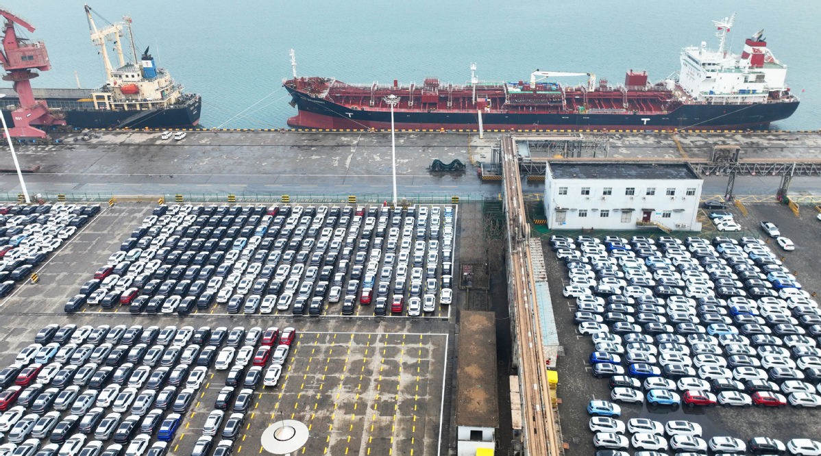 Domestic manufactured vehicles are parked at a port waiting to be exported abroad in Lianyungang, Jiangsu province on Jan 13, 2023. [Photo/Xinhua]