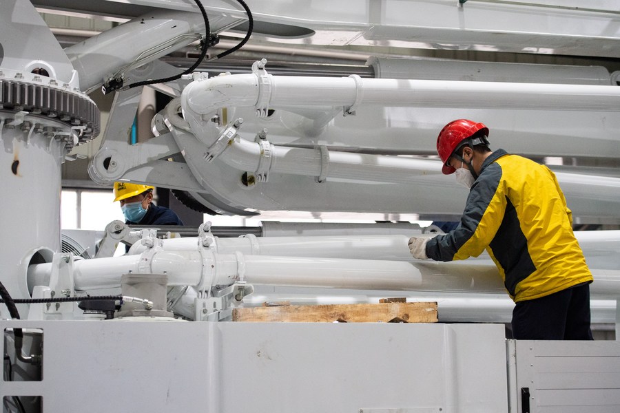 A staff member checks products in a workshop of Hunan Xanjer Heavy Industry Science and Technology Co., Ltd. at the Changde National High-Tech Industrial Development Zone in Changde City, central China's Hunan Province, Jan. 13, 2023. (Xinhua/Chen Sihan)