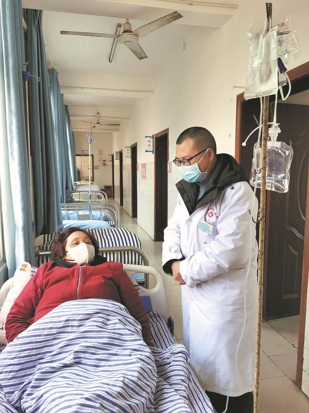 Xiao Chongjie, deputy head of Lianshan Township Central Hospital, talks with the only COVID-19 patient at the hospital during Spring Festival. LIU LANYING/FOR CHINA DAILY