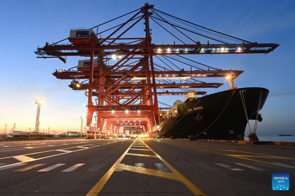 This photo taken on Jan. 31, 2023 shows a cargo ship docking at a container terminal of Ningbo Zhoushan Port in east China's Zhejiang Province. (Xinhua/Huang Zongzhi)