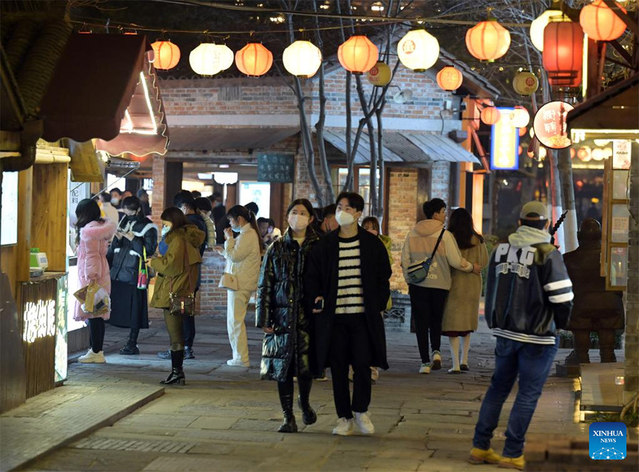 People walk on Leijie street, a commercial area famous for its night economy, in Hefei, east China's Anhui Province, Jan. 6, 2023. (Xinhua/Zhou Mu)