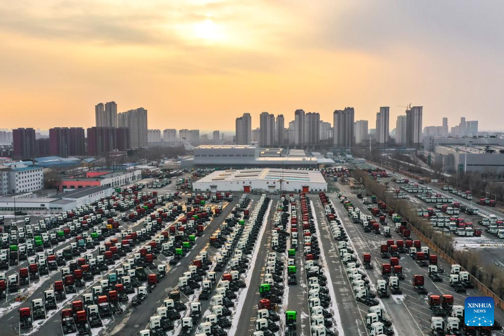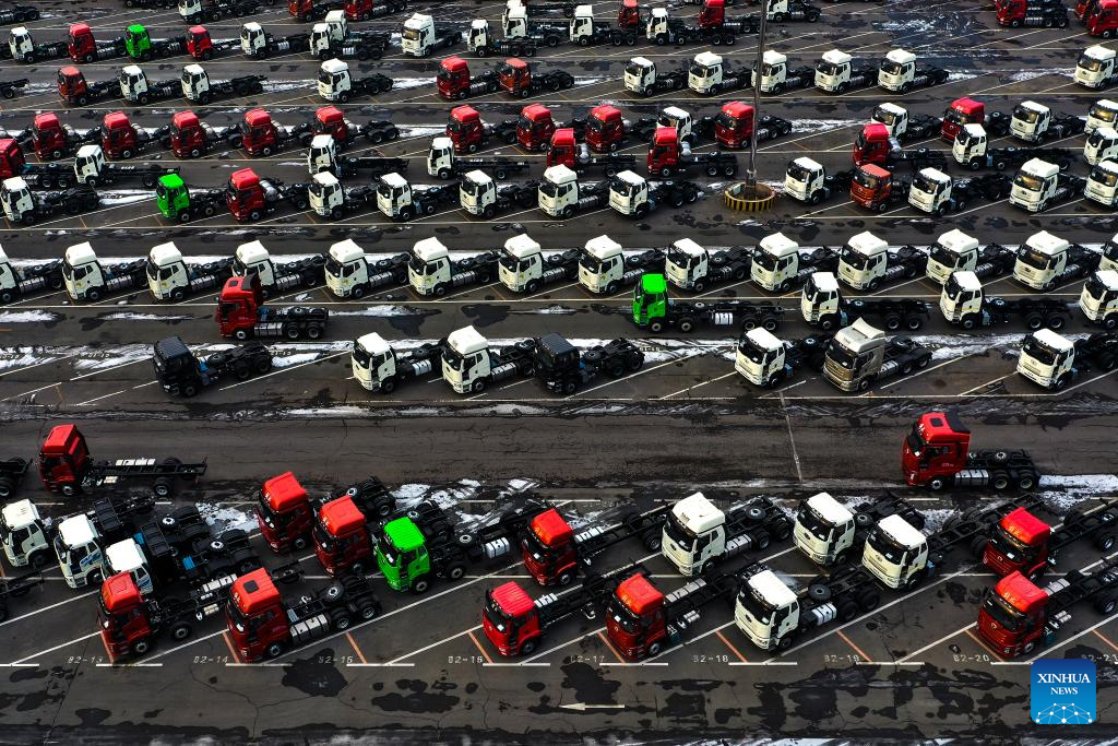 This aerial photo taken on Jan. 31, 2023 shows vehicles to be delivered at a parking lot of the FAW Jiefang in Changchun, northeast China's Jilin Province. Chinese truck maker FAW Jiefang has kick-started full production after the Spring Festival holiday. (Xinhua/Xu Chang)