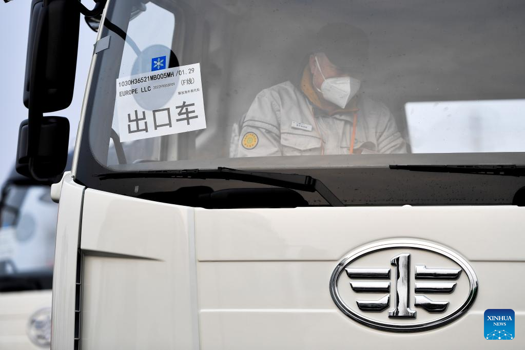 A worker checks up a vehicle to be delivered at a parking lot of the FAW Jiefang in Changchun, northeast China's Jilin Province, Jan. 31, 2023. Chinese truck maker FAW Jiefang has kick-started full production after the Spring Festival holiday. (Xinhua/Xu Chang)