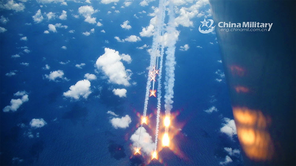 A fighter jet attached to an aviation division of air force under the PLA Southern Theater Command launches decoy flares in a recent flight training exercise. (eng.chinamil.com.cn/Photo by Gao Hongwei)