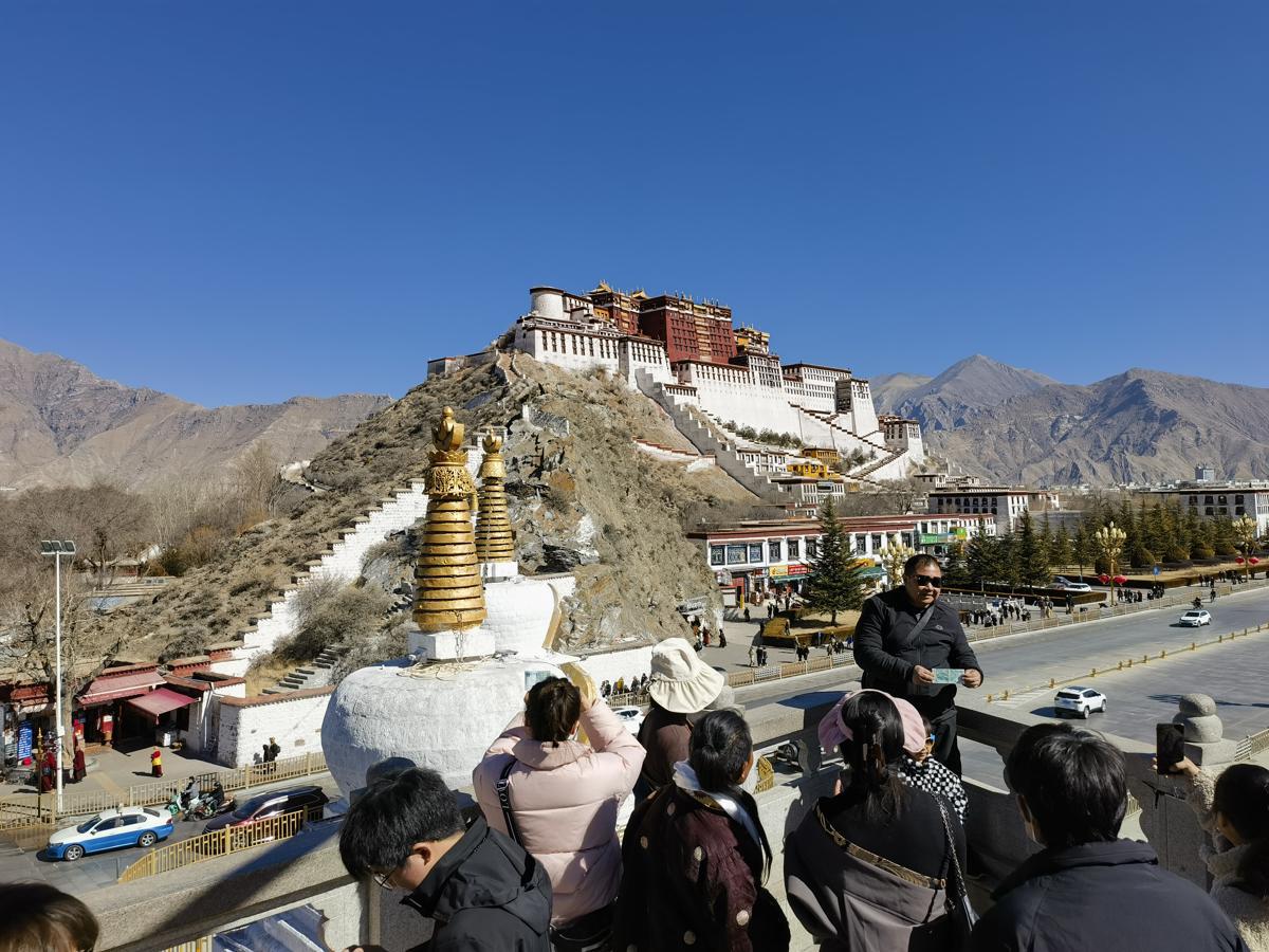 Tourists pose for photos in front of the Potala Palace in Lhasa, Tibet autonomous region, on Feb. 1, 2023. [Photo by Palden Nyima/For chinadaily.com.cn]