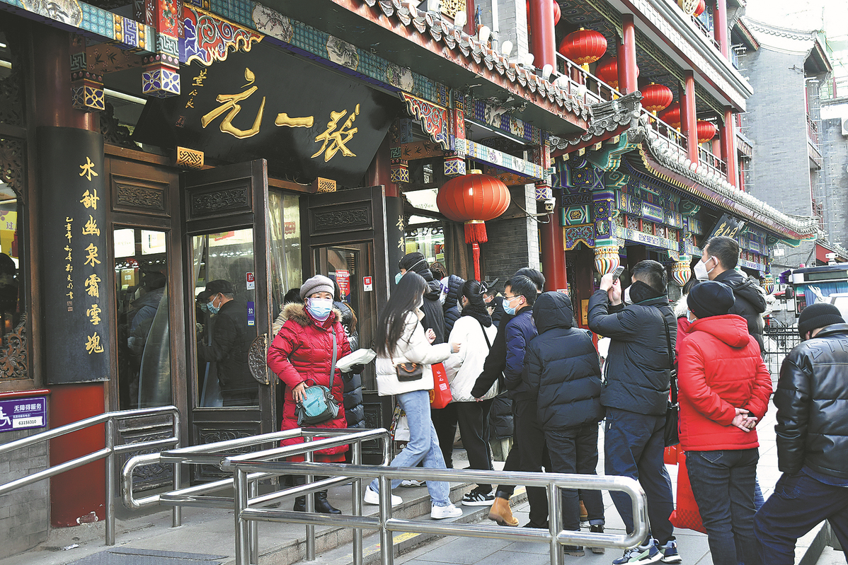 Consumers line up at a store of Zhangyiyuan, a Chinese time-honored tea brand, in Beijing in January. [Photo/China Daily]