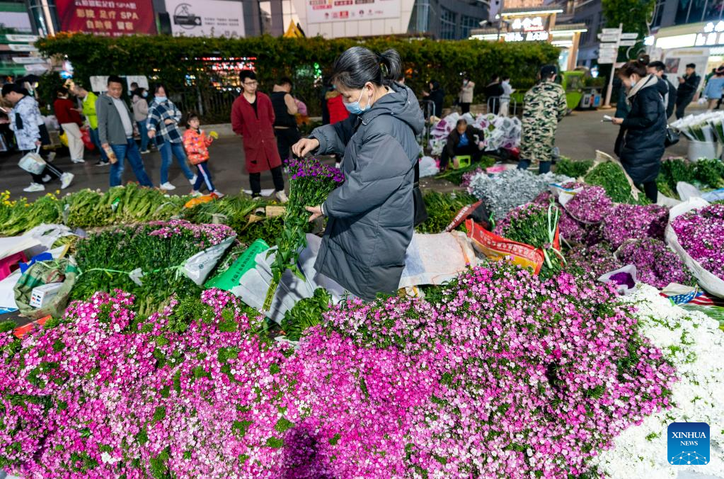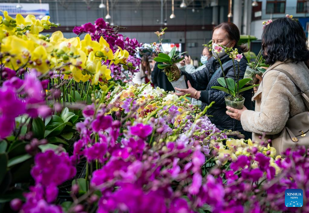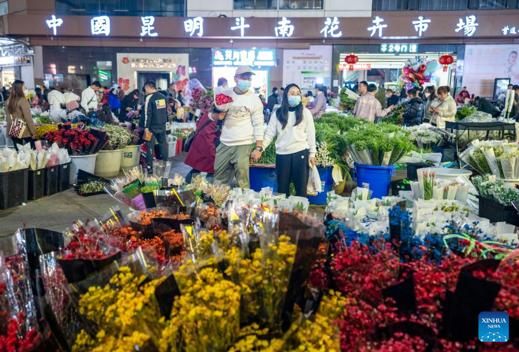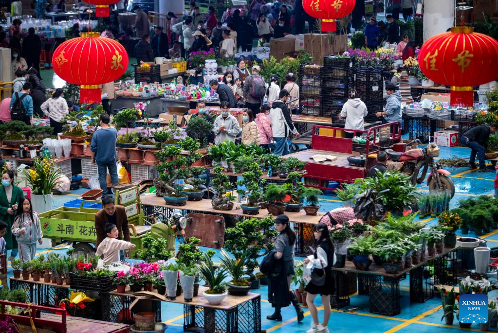People visit the Kunming Dounan Flower Market in southwest China's Yunnan Province, Jan. 31, 2023. Standing as China's largest fresh cut flower market in terms of both trade volume and export value, Dounan has become the largest fresh cut flower trading market in Asia. (Xinhua/Chen Xinbo)