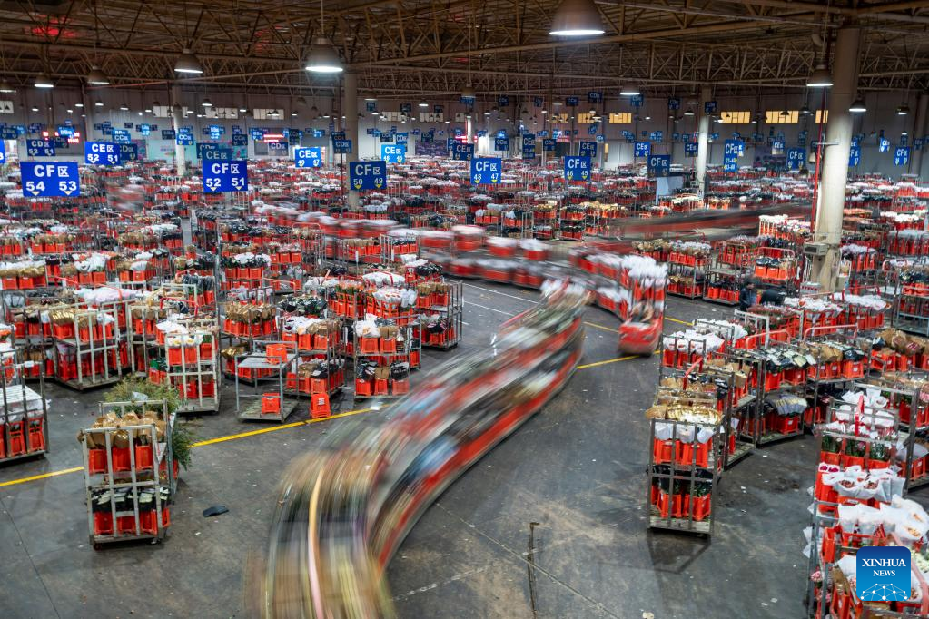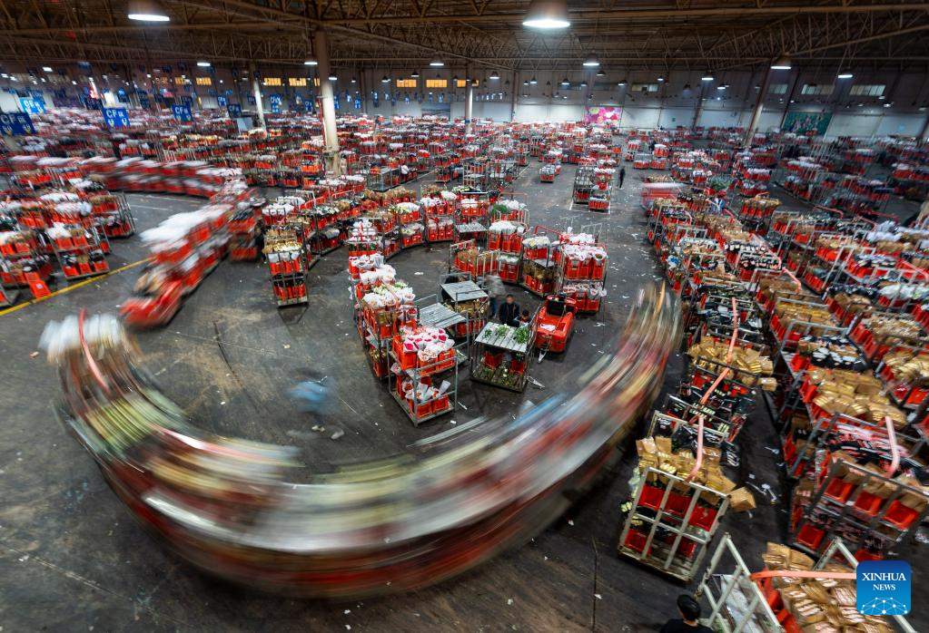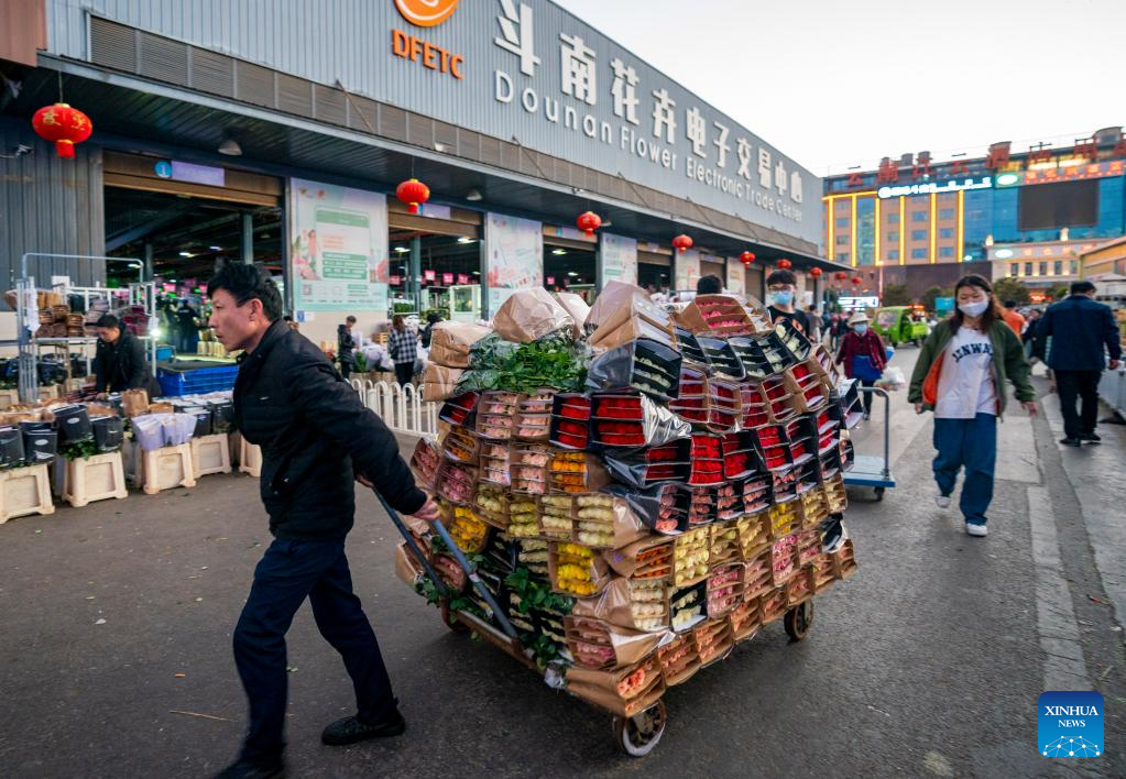 A worker transfers flowers at the Kunming Dounan Flower Market in southwest China's Yunnan Province, Jan. 31, 2023. Standing as China's largest fresh cut flower market in terms of both trade volume and export value, Dounan has become the largest fresh cut flower trading market in Asia. (Xinhua/Chen Xinbo)