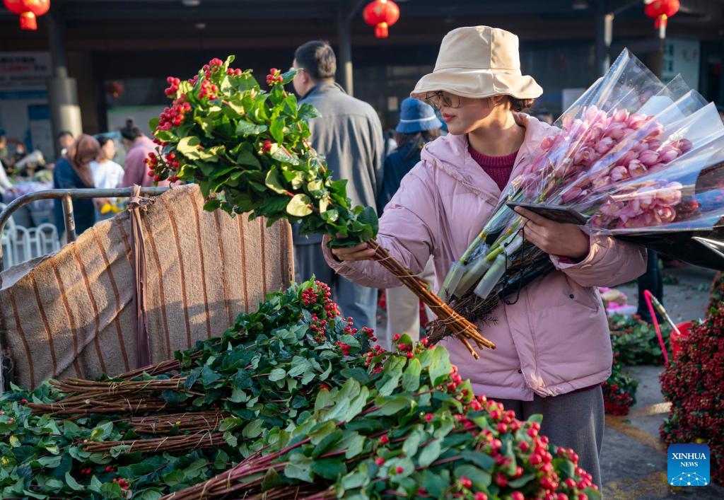 A customer selects flowers at the Kunming Dounan Flower Market in southwest China's Yunnan Province, Jan. 31, 2023. Standing as China's largest fresh cut flower market in terms of both trade volume and export value, Dounan has become the largest fresh cut flower trading market in Asia. (Xinhua/Chen Xinbo)