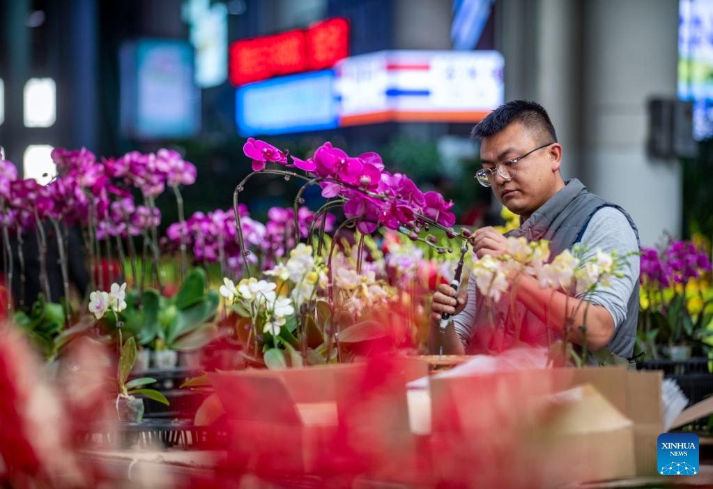 A merchant works at the Kunming Dounan Flower Market in southwest China's Yunnan Province, Jan. 31, 2023. Standing as China's largest fresh cut flower market in terms of both trade volume and export value, Dounan has become the largest fresh cut flower trading market in Asia. (Xinhua/Chen Xinbo)