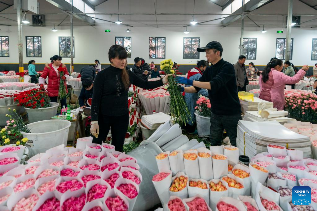 Workers pack flowers at the Kunming Dounan Flower Market in southwest China's Yunnan Province, Jan. 31, 2023. Standing as China's largest fresh cut flower market in terms of both trade volume and export value, Dounan has become the largest fresh cut flower trading market in Asia. (Xinhua/Chen Xinbo)