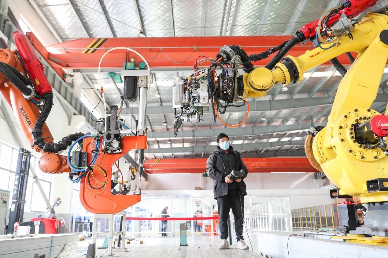 A worker controls robotic arms to manufacture products in a workshop of an intelligent technology company in Shanghai, Jan. 10, 2023. (People's Daily Online/Jiang Huihui)