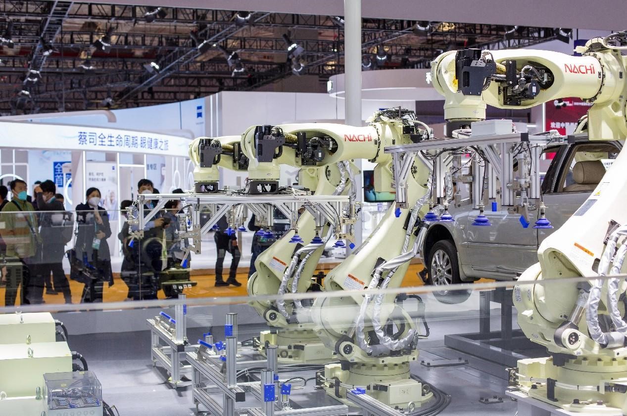 Vehicle-assembling robots are exhibited at the fifth China International Import Expo in Shanghai, Nov. 7, 2022. (People's Daily Online/Zhai Huiyong)