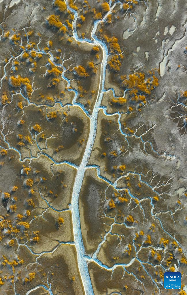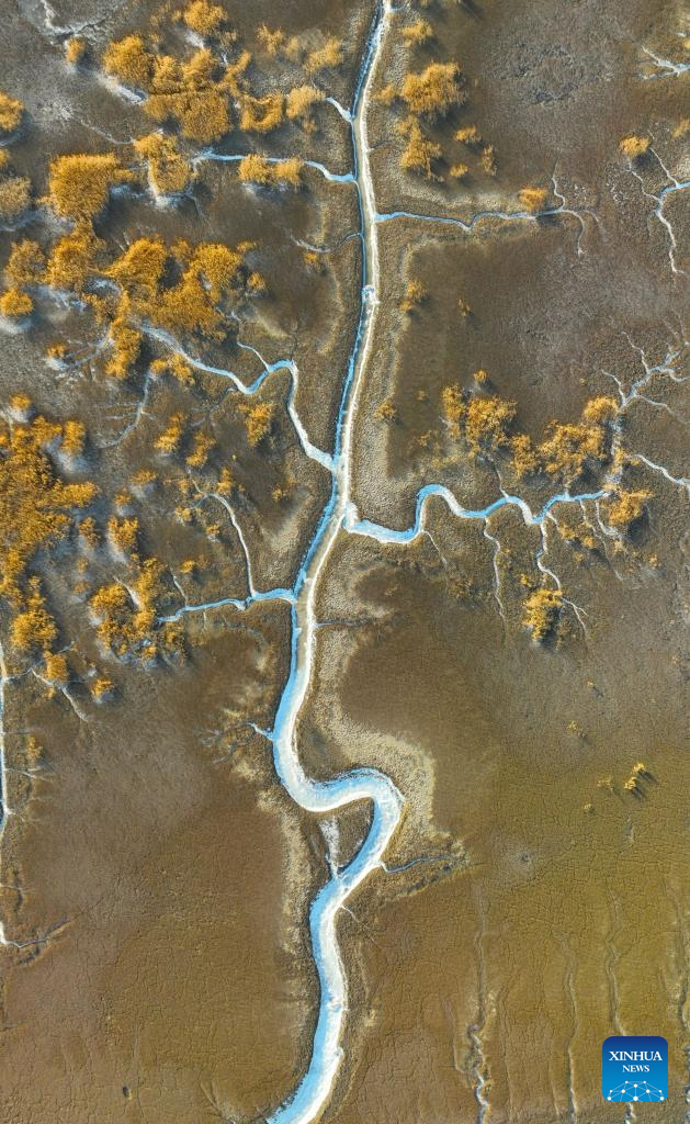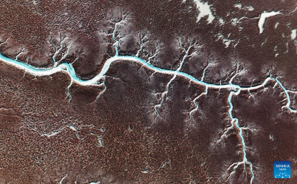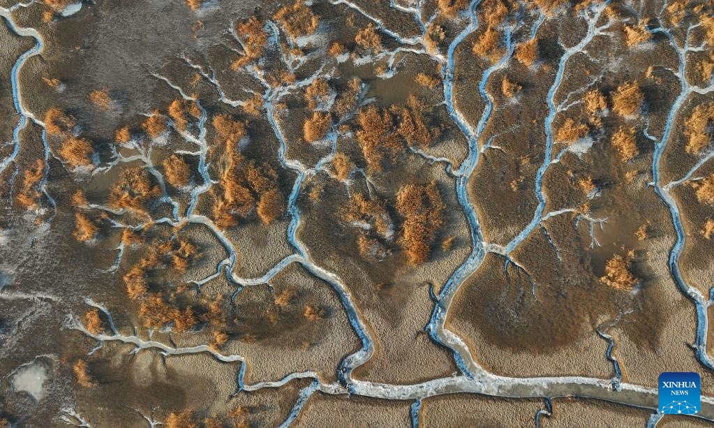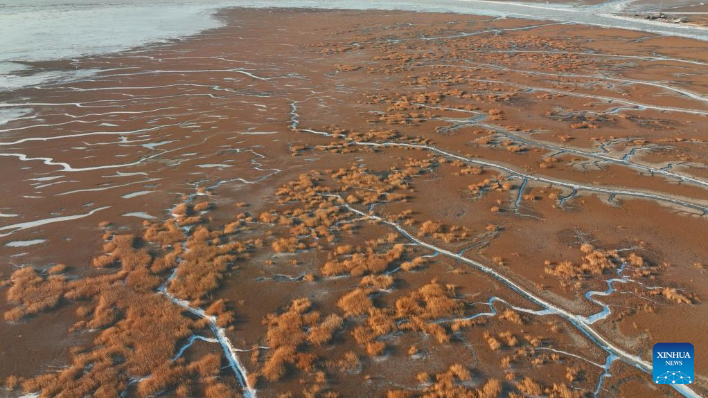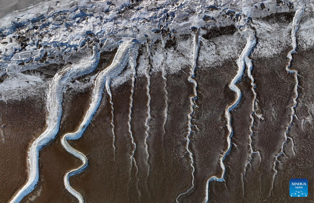 This aerial photo taken on Feb. 1, 2023 shows a view of frozen tidal creeks in the wetland of Liaohe River estuary in Panjin, northeast China's Liaoning Province. (Xinhua/Yang Qing)