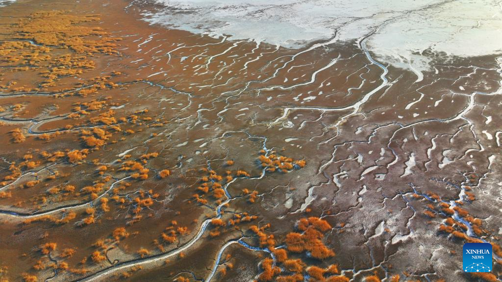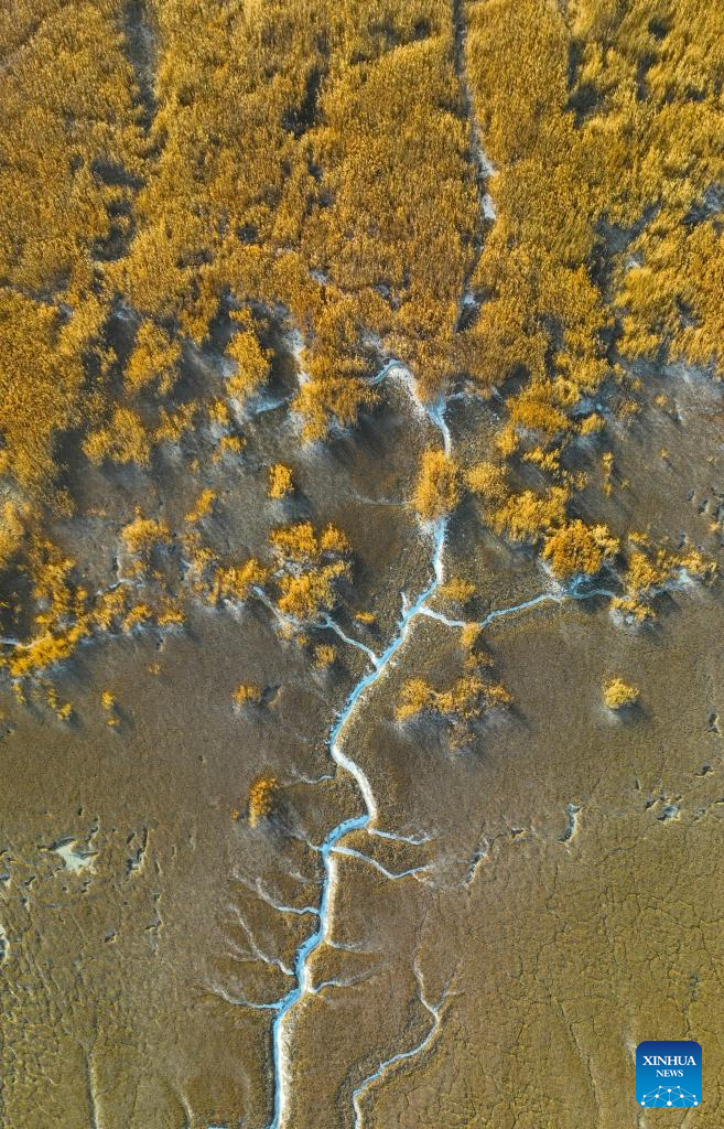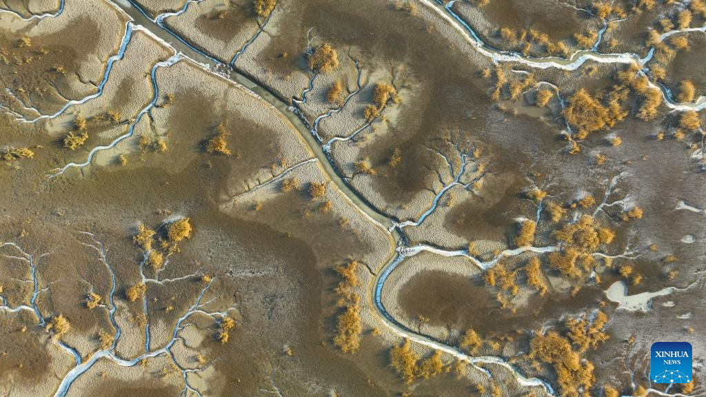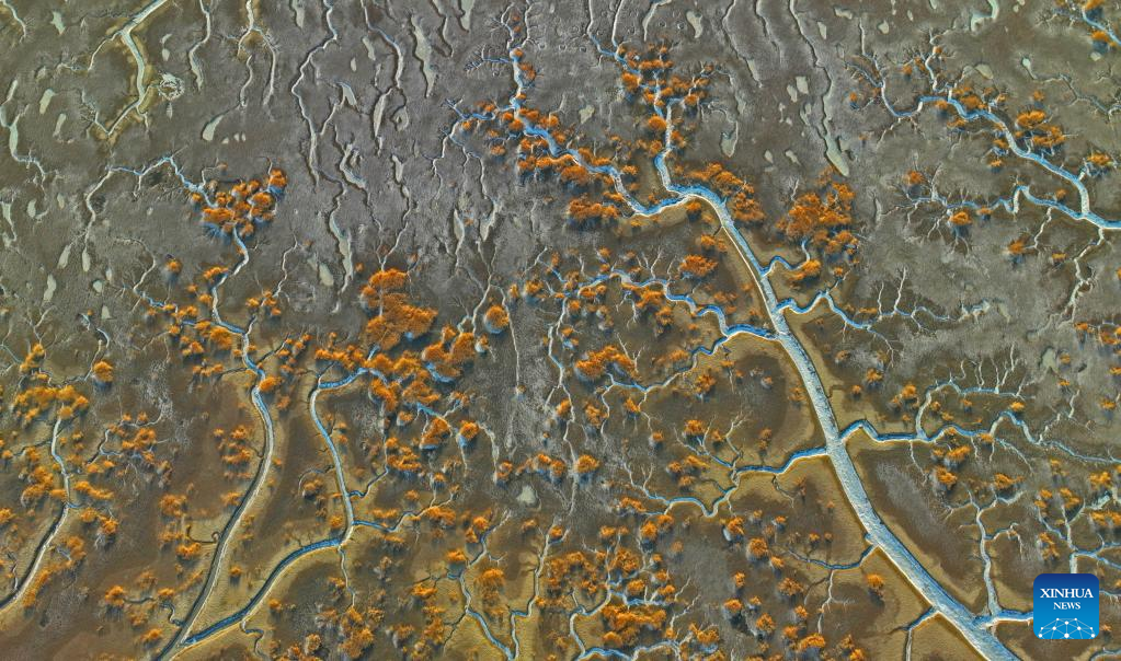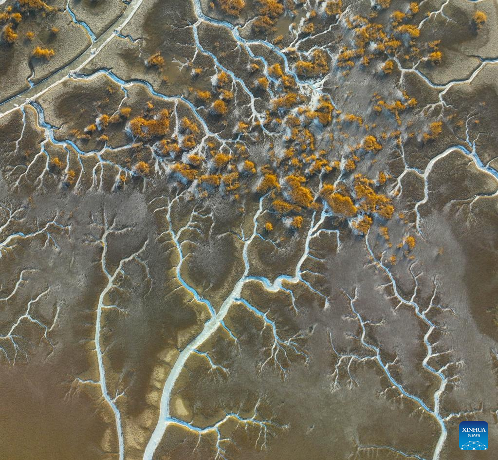 This aerial photo taken on Feb. 1, 2023 shows a view of frozen tidal creeks in the wetland of Liaohe River estuary in Panjin, northeast China's Liaoning Province. (Xinhua/Yang Qing)