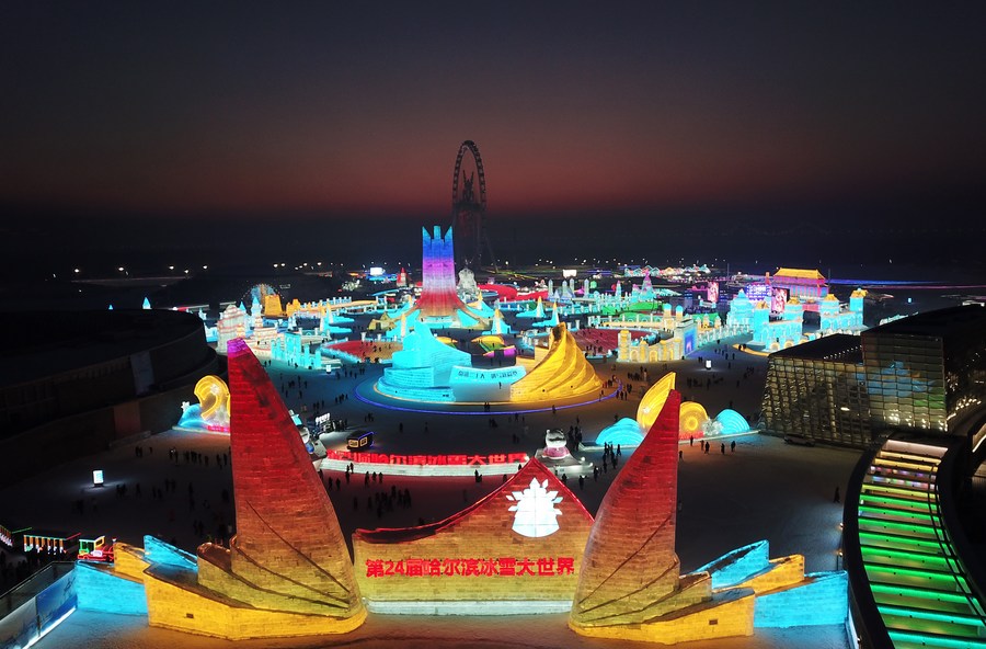 This aerial photo taken on Jan. 5, 2023 shows tourists visiting the Harbin Ice-Snow World theme park in Harbin, northeast China's Heilongjiang Province. (Xinhua/Wang Jianwei)