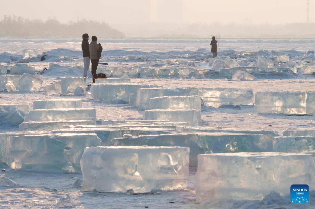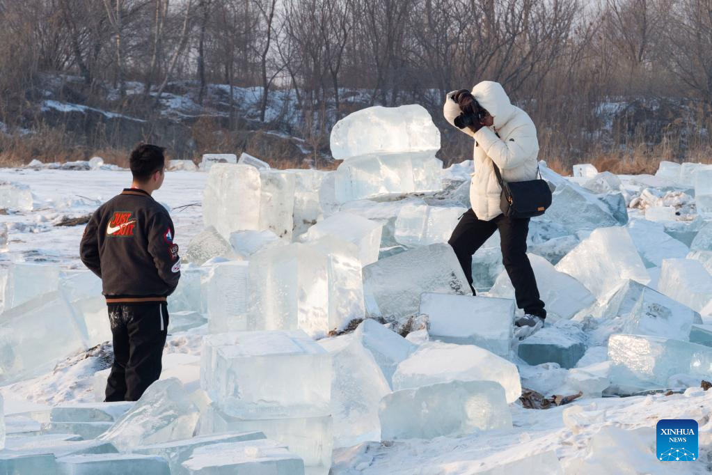 People view ice cubes at a section of Songhuajiang River in Harbin, northeast China's Heilongjiang Province, Feb. 1, 2023. This section of frozen river used to be the source of natural ice for installations at the Harbin Ice and Snow World. Some giant ice cubes were cut out but left there unused. (Xinhua/Xie Jianfei)