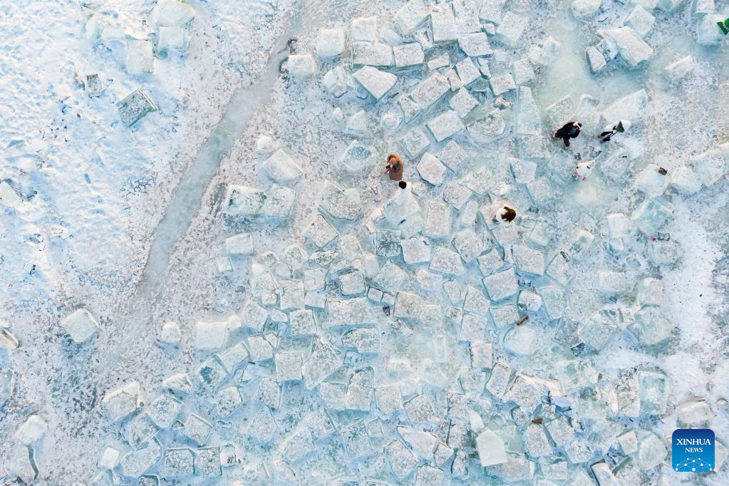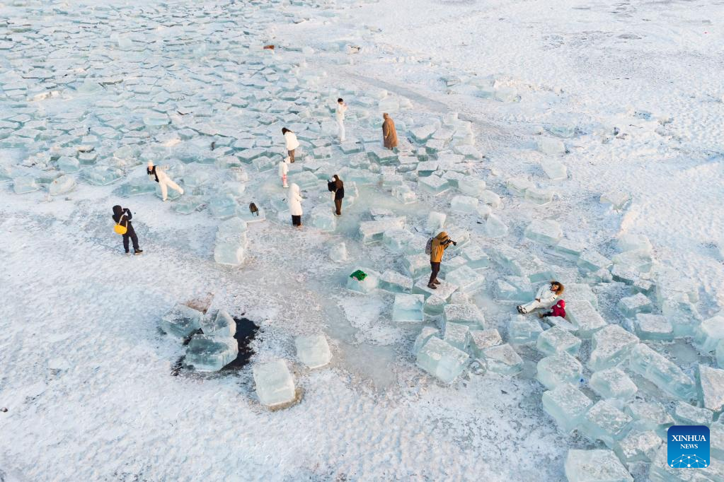 This aerial phote taken on Feb. 1, 2023 shows people posing for photos on ice cubes at a section of Songhuajiang River in Harbin, northeast China's Heilongjiang Province. This section of frozen river used to be the source of natural ice for installations at the Harbin Ice and Snow World. Some giant ice cubes were cut out but left there unused. (Xinhua/Xie Jianfei)